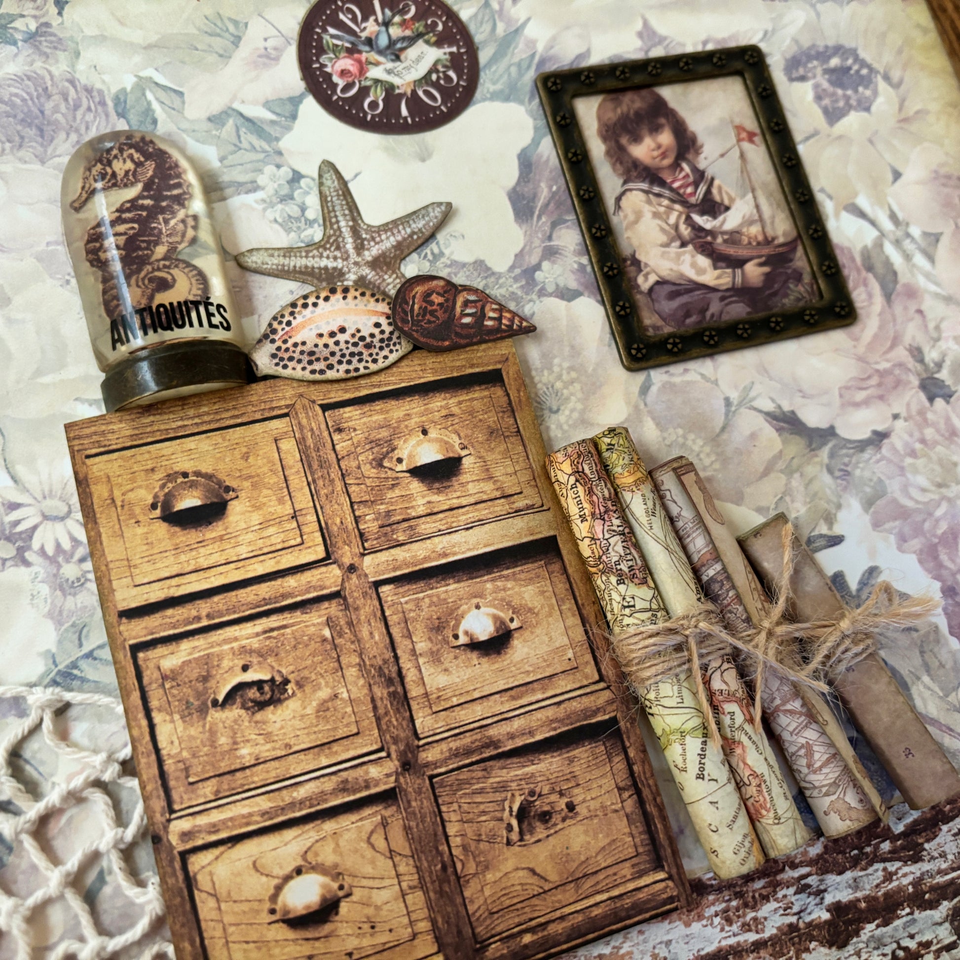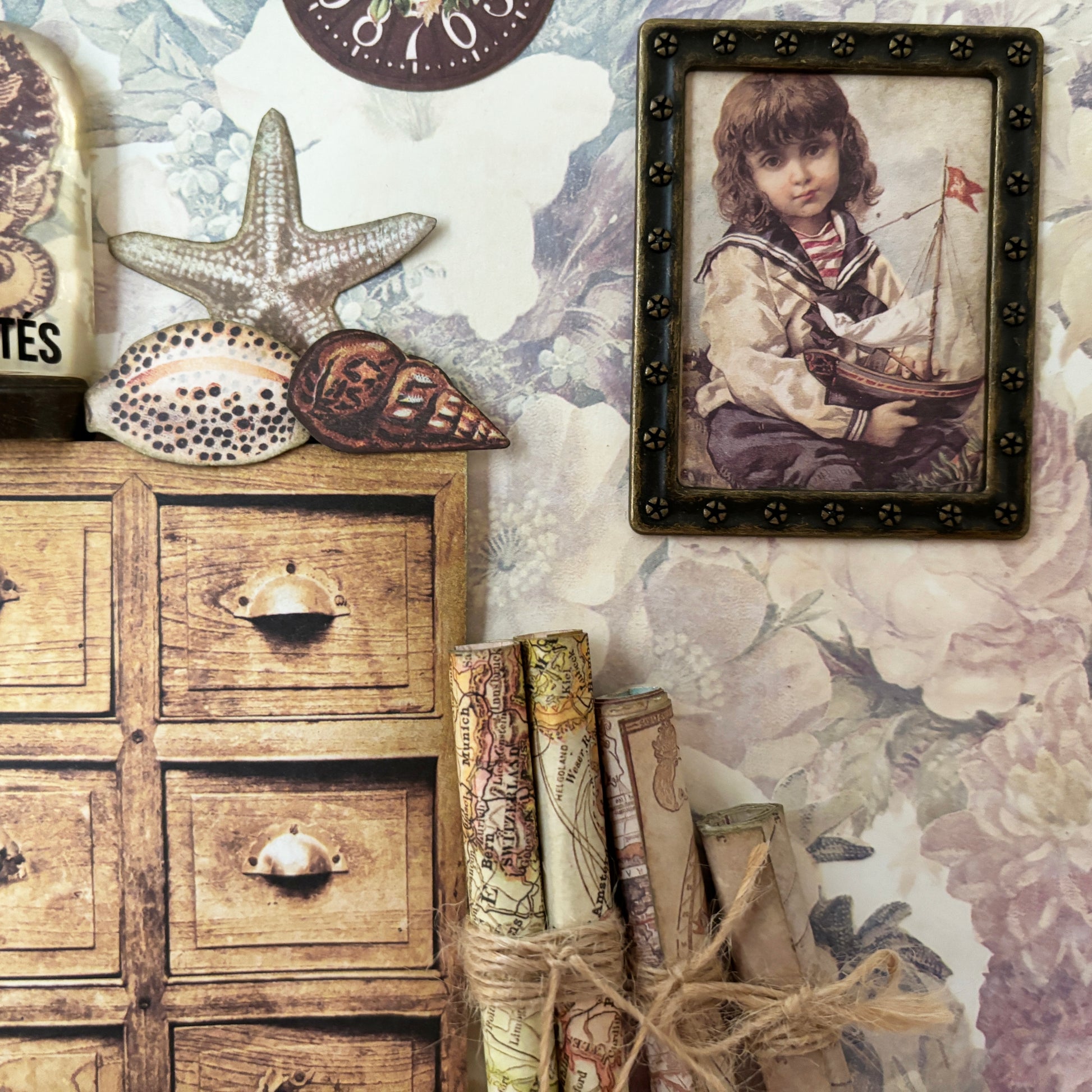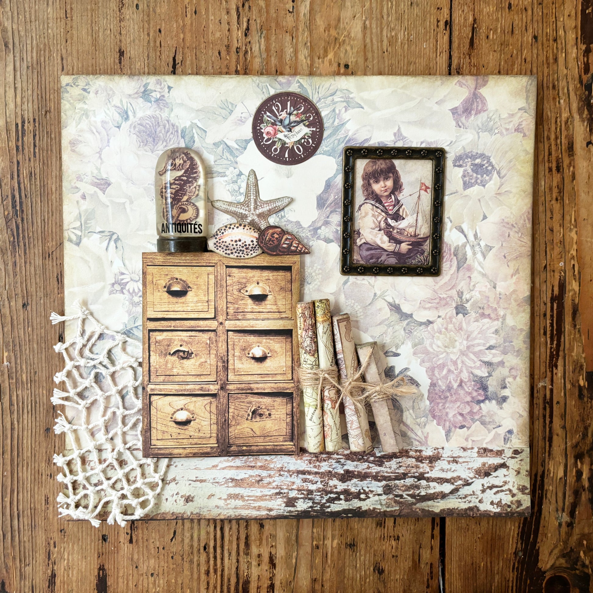A beautiful collage, depicting the room of a fisherman, filled with a painting of his daughter playing with a toy boat, sea charts and sea shells he found on the beach. Made with top quality paper from Prima Marketing. Ready to frame. Will be shipped flat and secured. See more details about this collage on my Youtube channel here: