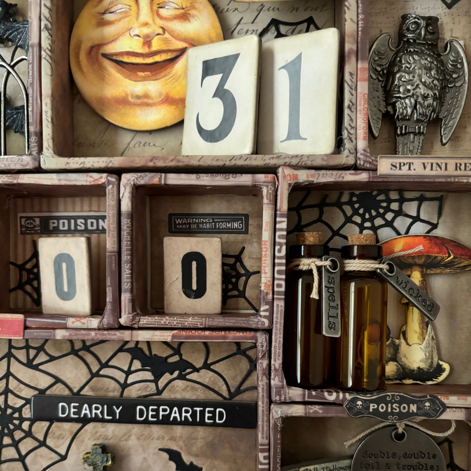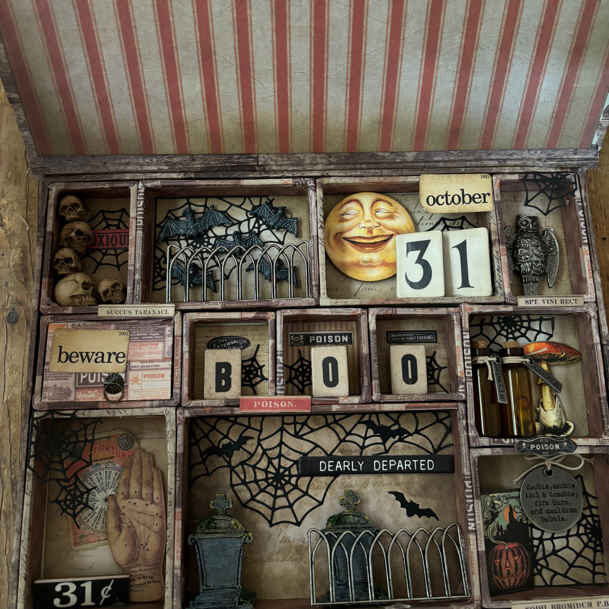 This big Halloween box is stuffed with everything creepy! The box opens by lifting up the front, to reveal a cabinet of creepy smaller boxes! This is an awesome gift for any Halloween fan. The longer you look, the more you see. It features a creepy moon, the numbers 31, skulls, headstones, spiderwebs, poison bottles.. Check out all the details about this box on my Youtube channel: