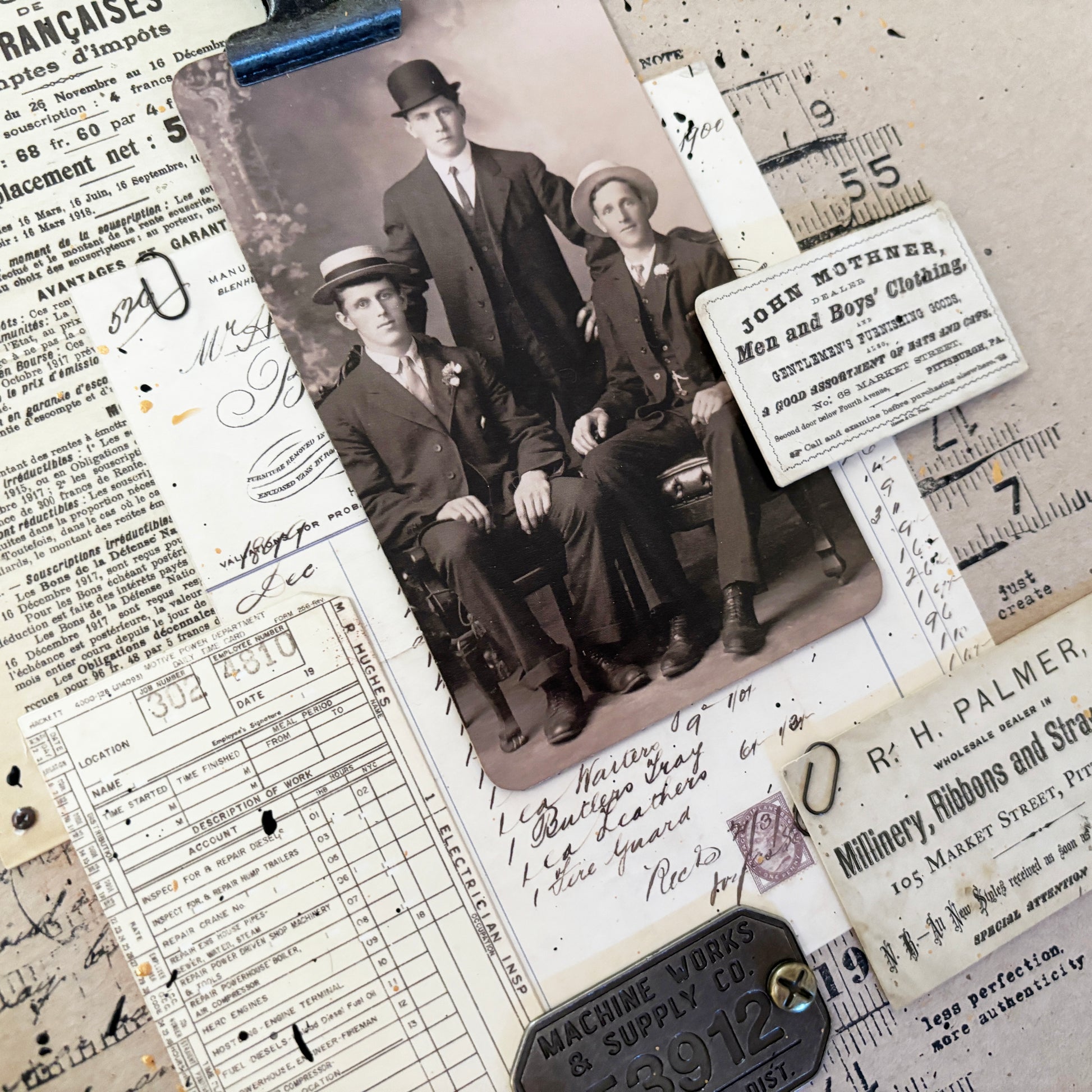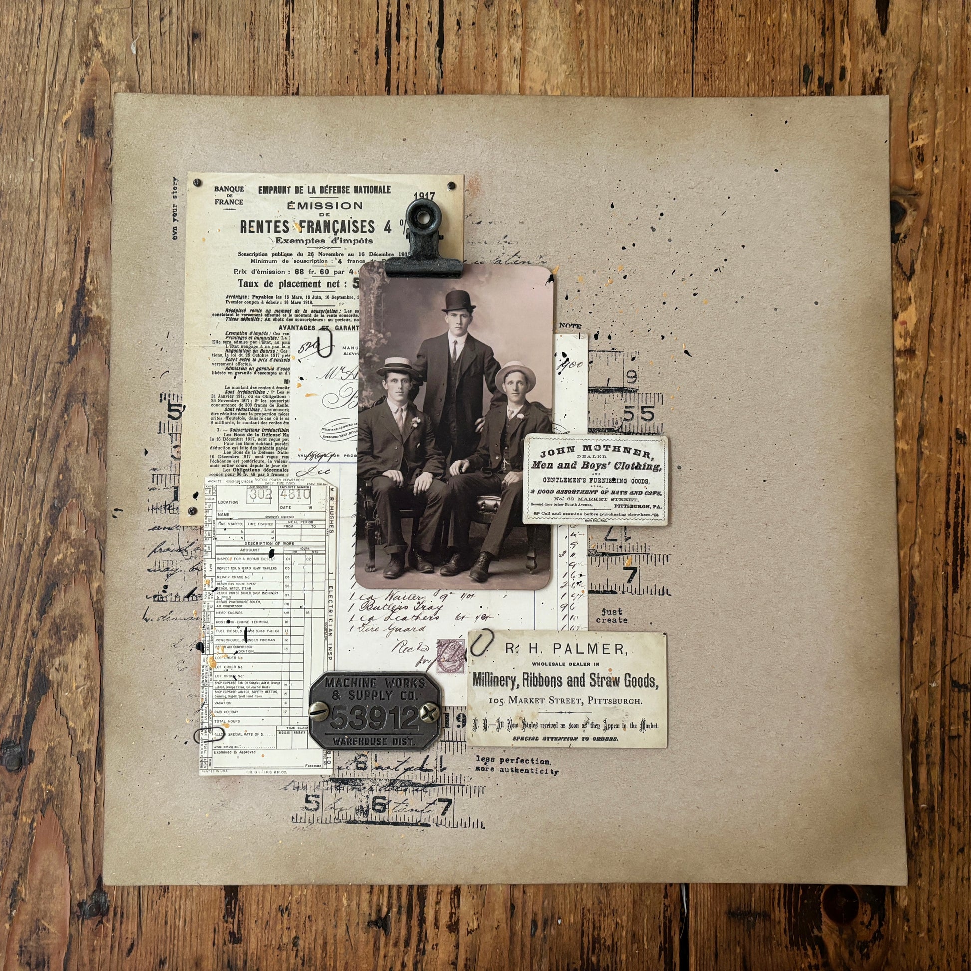 A vintage collage featuring old scraps of men's atelier image from the past. Ready to frame. Will be shipped flat and protected. The collage measures about 30 x 30 cm.