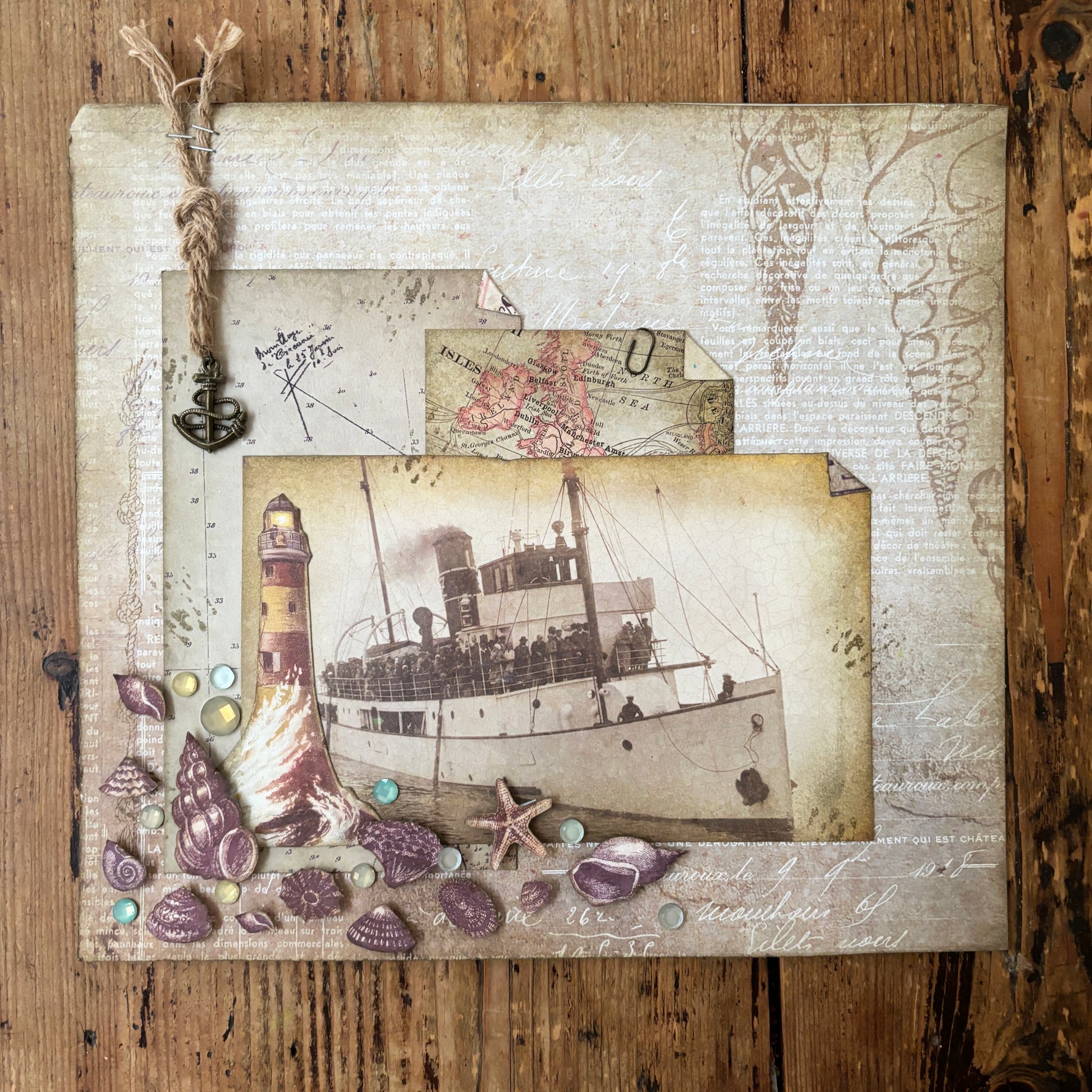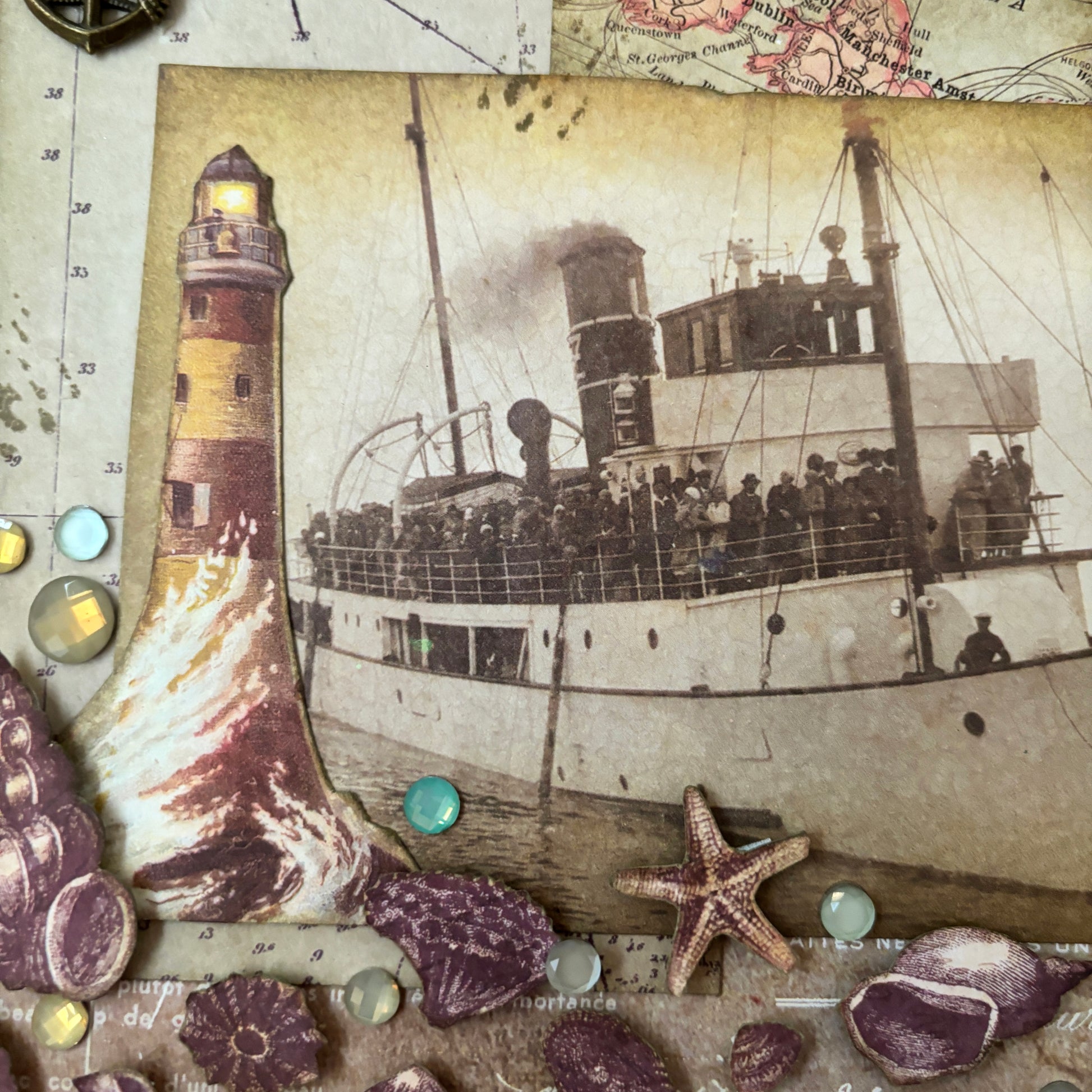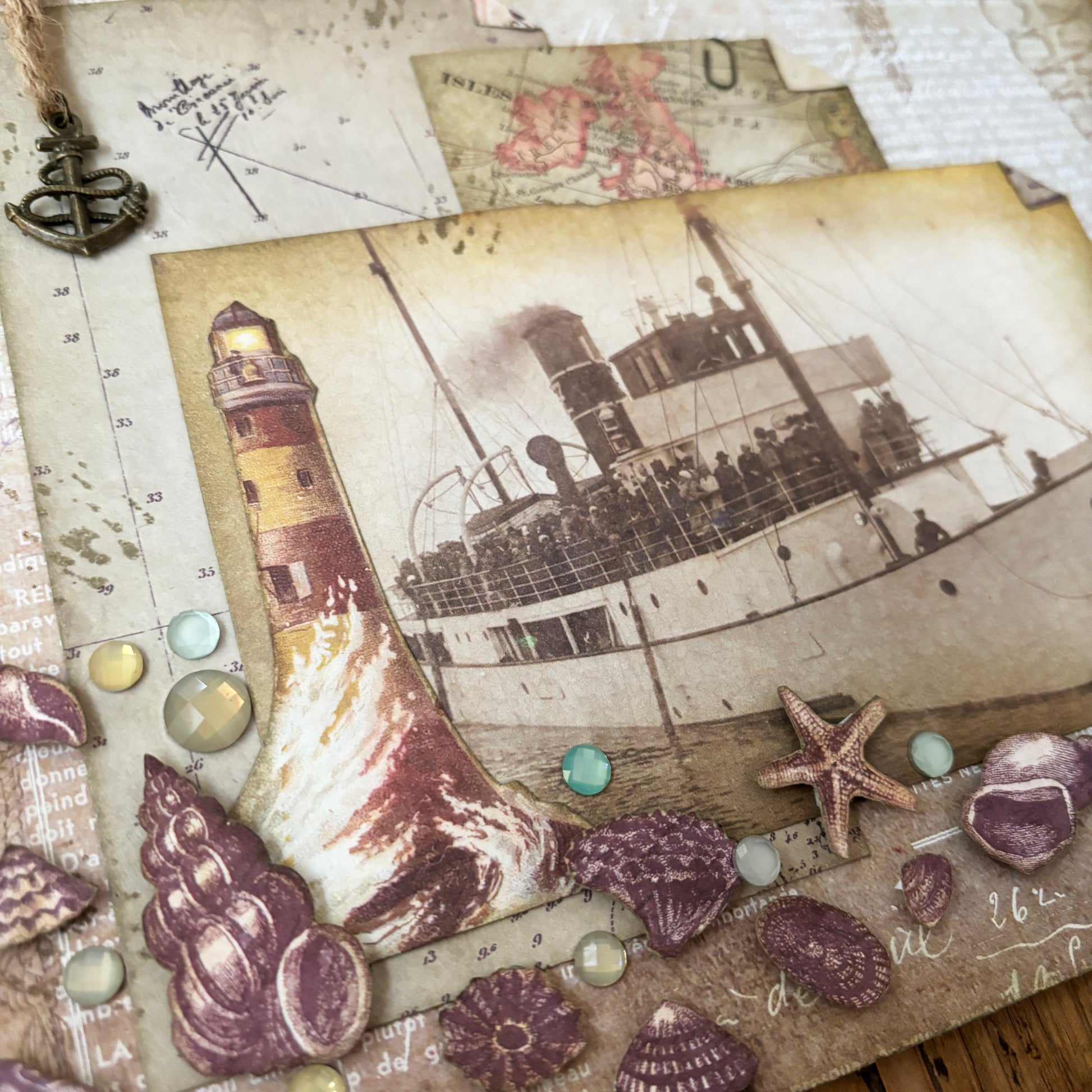 An ocean themed collage, featuring beautiful sea shimmers and a bronze anchor. Let this collage take you back to the vintage sea side. Ready to frame.