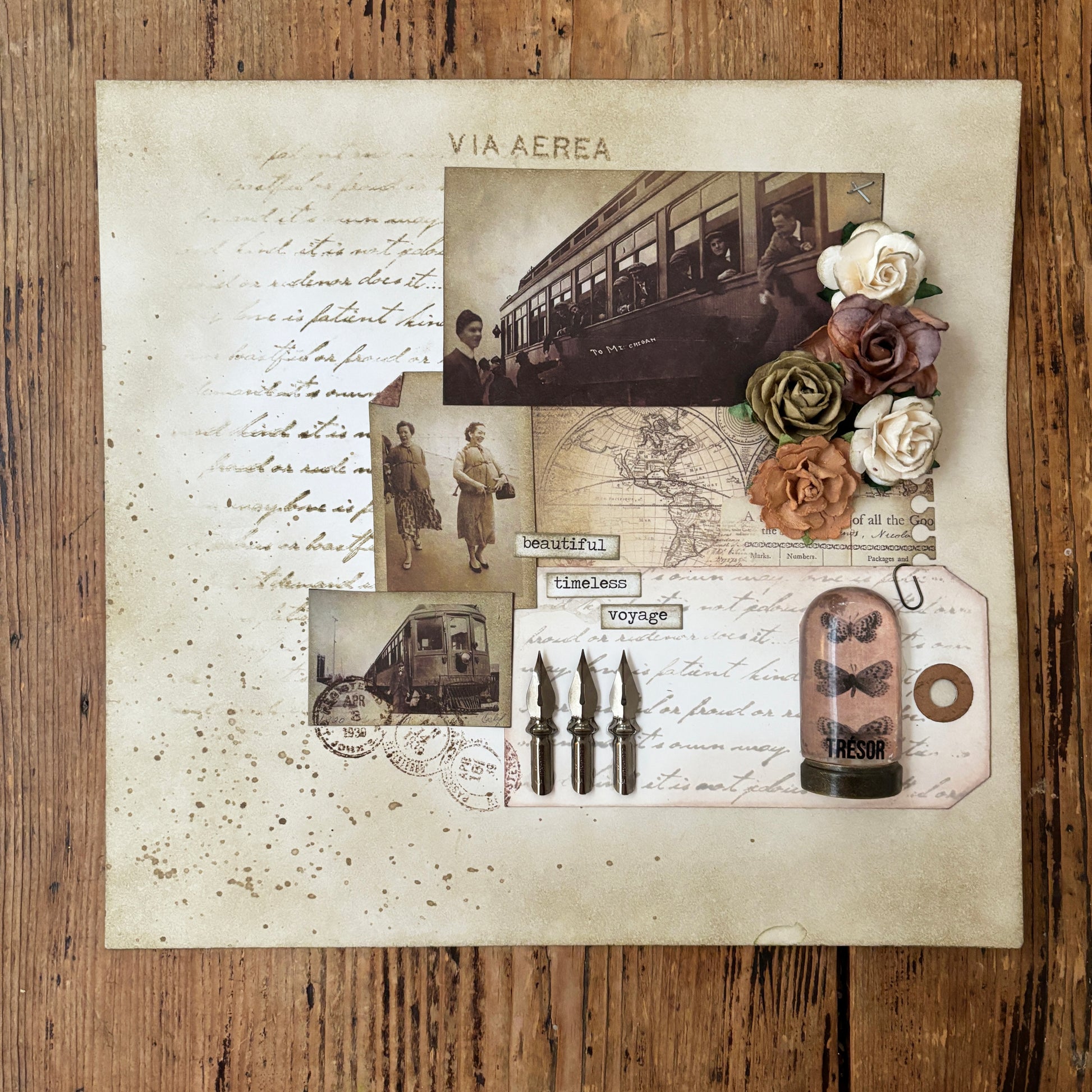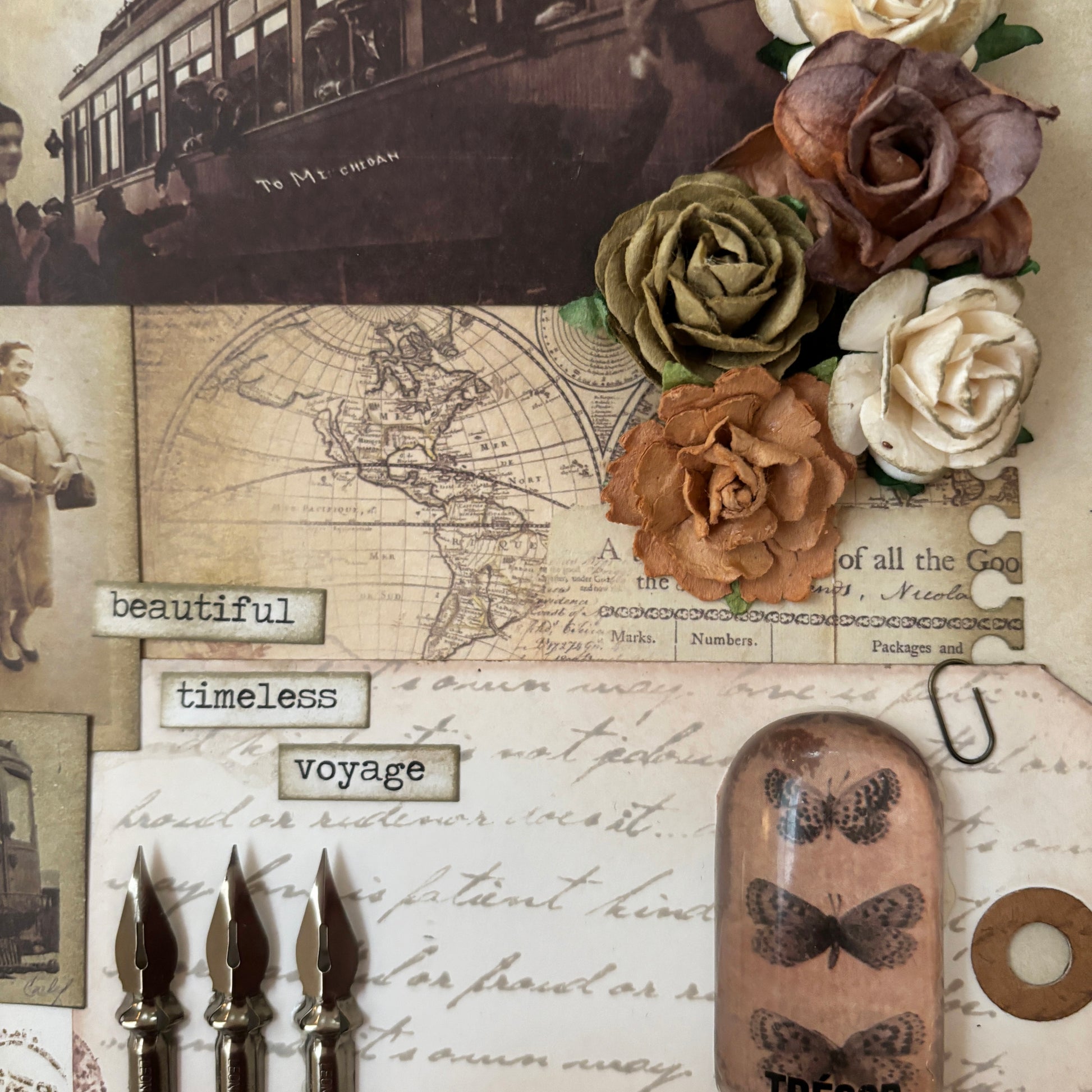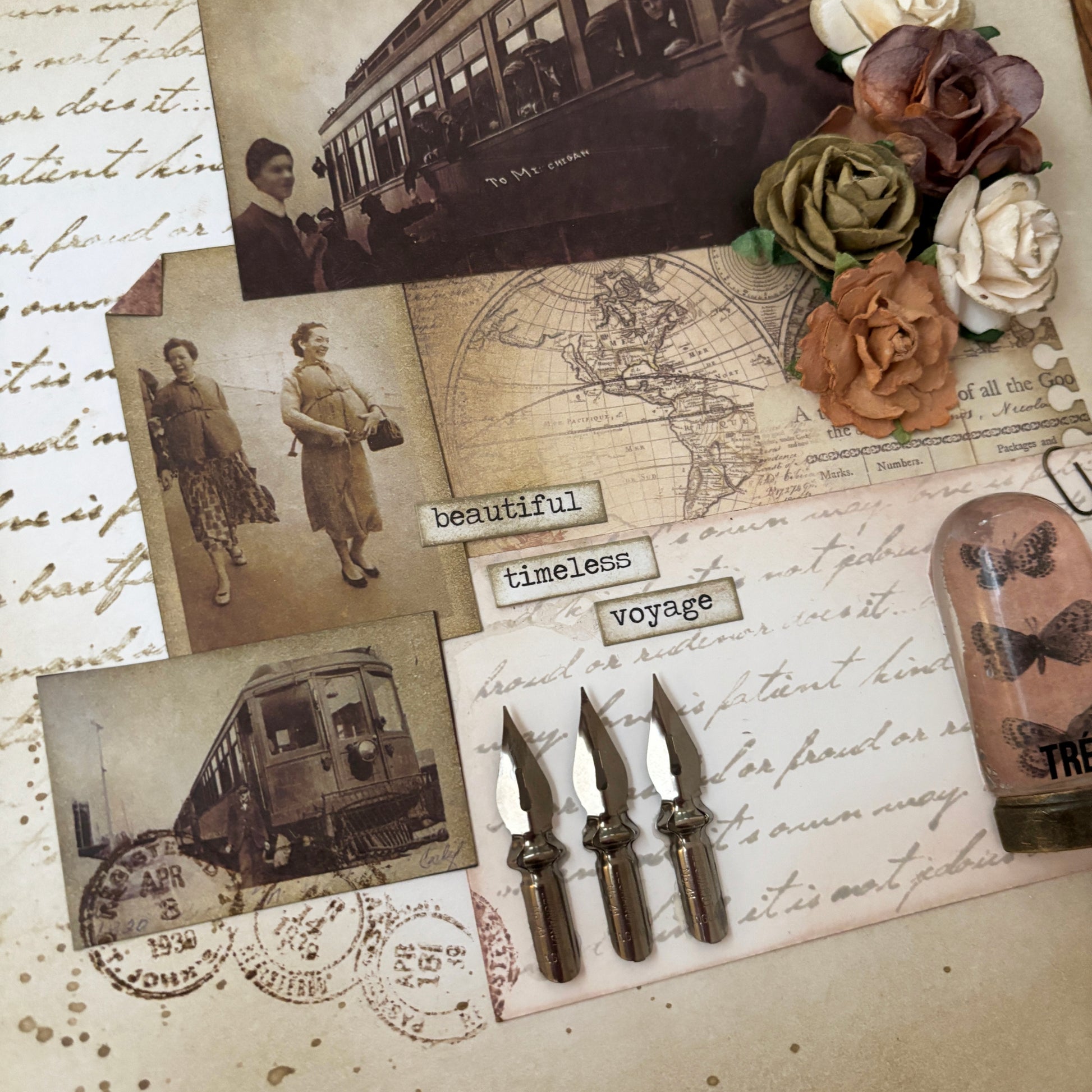 This collage is inspired by the post carriages of the old days. It features beautiful bronze pen nibs, flowers and tags. The collage is made with top quality paper and ink. Ready to frame & love!